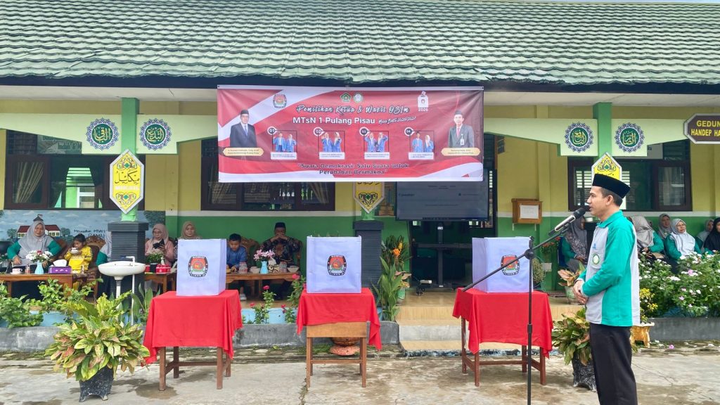 PULANG PISAU (Humas) Madrasah Tsanawiyah Negeri (MTsN) 1 Pulang Pisau melakukan terobosan dalam berorganisasi melalui gelaran pemilihan Ketua dan Wakil Ketua Organisasi Siswa Intra Madrasah (OSIM) Masa Bakti 2026/2027. Acara yang digelar pada Jumat (13/02/2026) ini dibuka secara resmi oleh Kepala Kantor Kementerian Agama Kabupaten Pulang Pisau, H. Kusnan Fatkhudin, S.Ag, M.AP. Dan ibu ketua DWP Kemenag Pulang Pisau Hj.Masniah, S.Ag, Kasi pendidikan Islam Purnamawati, SH. M.Pd dan Pengewas Madrasah Salbiah.S.Pd.I, M.Pd.